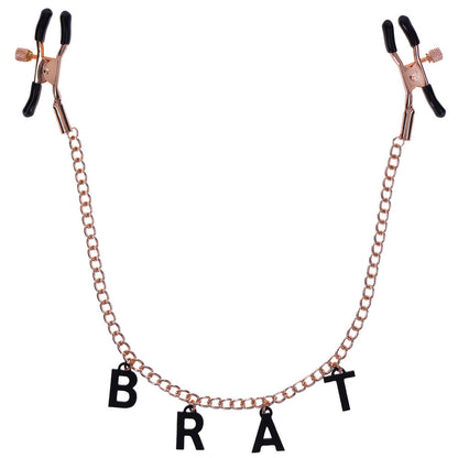 Embrace your brattiest attributes and proudly display your naughtiness with the Brat Charmed Nipple Clamps! Adjust the tension and explore pleasure at every intensity with the rubber tipped, rose gold chained nipple clamps. Own every teasing quality you love with the black charms stretched across the chain labelling you for what you love to be, a BRAT!
