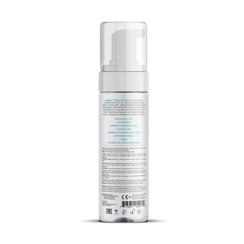 simplyT Foam and Fresh is a carefully crafted blend of an active antibacterial agent along with natural antimicrobial and antiseptic elements tea tree, eucalyptus, peppermint, lavender, and rosemary oils. Our foaming cleanser will keep things fresh, giving you playtime peace of mind.