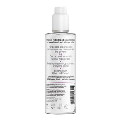 simply� Timeless lube is uniquely formulated to address the specific needs of individuals during the perimenopausal and menopausal stages and beyond. Each formula contains ingredients that can help alleviate dryness and promote a more comfortable and satisfying intimate experience. Each lube contains supportive ingredients like aloe, olive leaf extract, squalane, and Vitamin E. These supportive ingredients are what makes it different from the rest of the simply� line. Like all products under the simply� label, Timeless formulas are free from glycerin, parabens, and propylene glycol. Can also be used as a daily vaginal moisturiser.