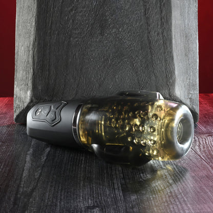 Enjoy sucking on demand with this vibrating stroker that delivers immediate suction while you press - and quick release when you don't. A separate button offers an automatic suction option while the inner chamber buzzes with the strength of two vibrating bullets cushioned behind a deliciously textured channel.